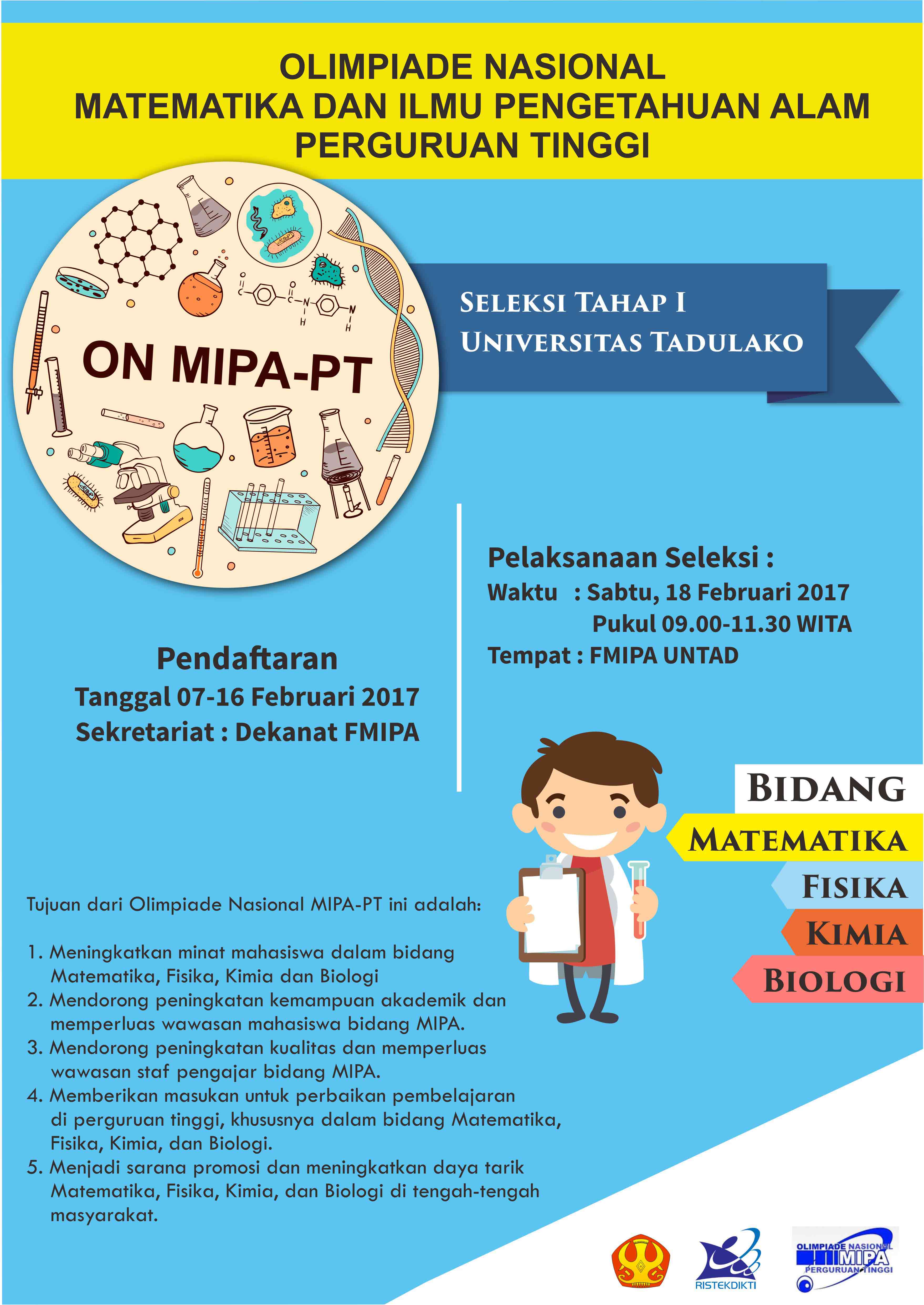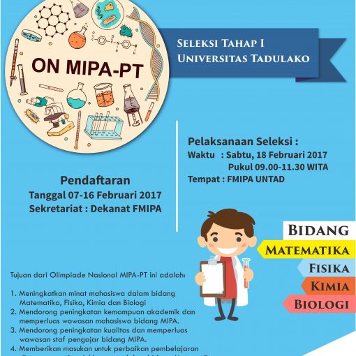 Olimpiade Nasional Matematika dan Ilmu Pengetahuan Alam Perguruan Tinggi Seleksi Tahap I Universitas Tadulako PENDAFTARAN Tanggal : 07-16 Februari 2017 SELEKSI Waktu […]